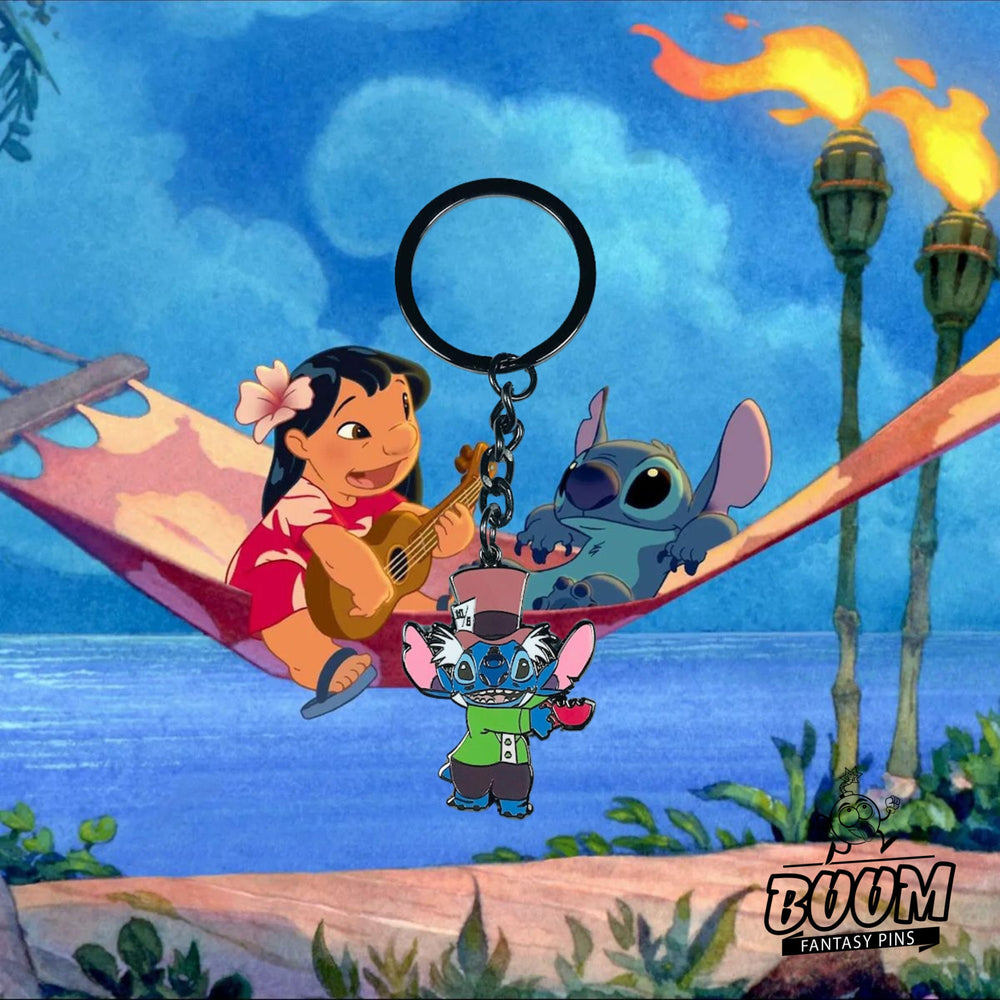 Imagina el suave susurro de las hojas de palmera mezclándose con el delicado tintineo de las tazas de té, una escena donde convergen el aloha y la fantasía. La energía vivaz del personaje de Stitch brilla a través de su excéntrico sombrero y su colorido conjunto; cada detalle, una pincelada que pinta una vívida imagen de la magia isleña fusionada con la fantasía del País de las Maravillas. Este llavero es un pequeño portal a ese momento: una pieza tangible de narrativa donde el caos se mezcla con gracia y encanto, y cada mirada provoca una sonrisa.