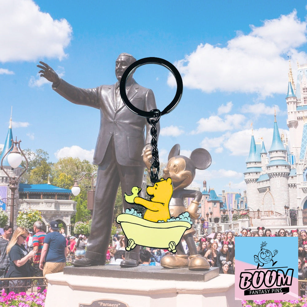 Nuestro llavero – Winnie the Pooh de Winnie the Pooh – Disney Fantasy | Accesorio coleccionable para la hora del baño para los amantes de Winnie the Pooh y regalos de dibujos animados adorables captura uno de estos momentos preciados: una escena de baño encantadora donde Pooh se relaja, envuelto en el abrazo reconfortante de la serenidad pastel. Es una tierna viñeta que brilla con detalles divertidos y una calidez que se refleja en cada mirada.