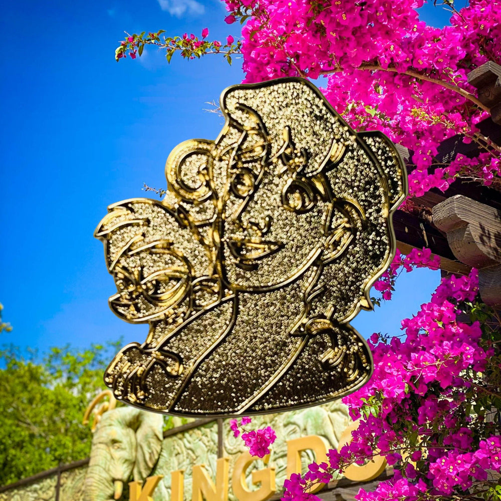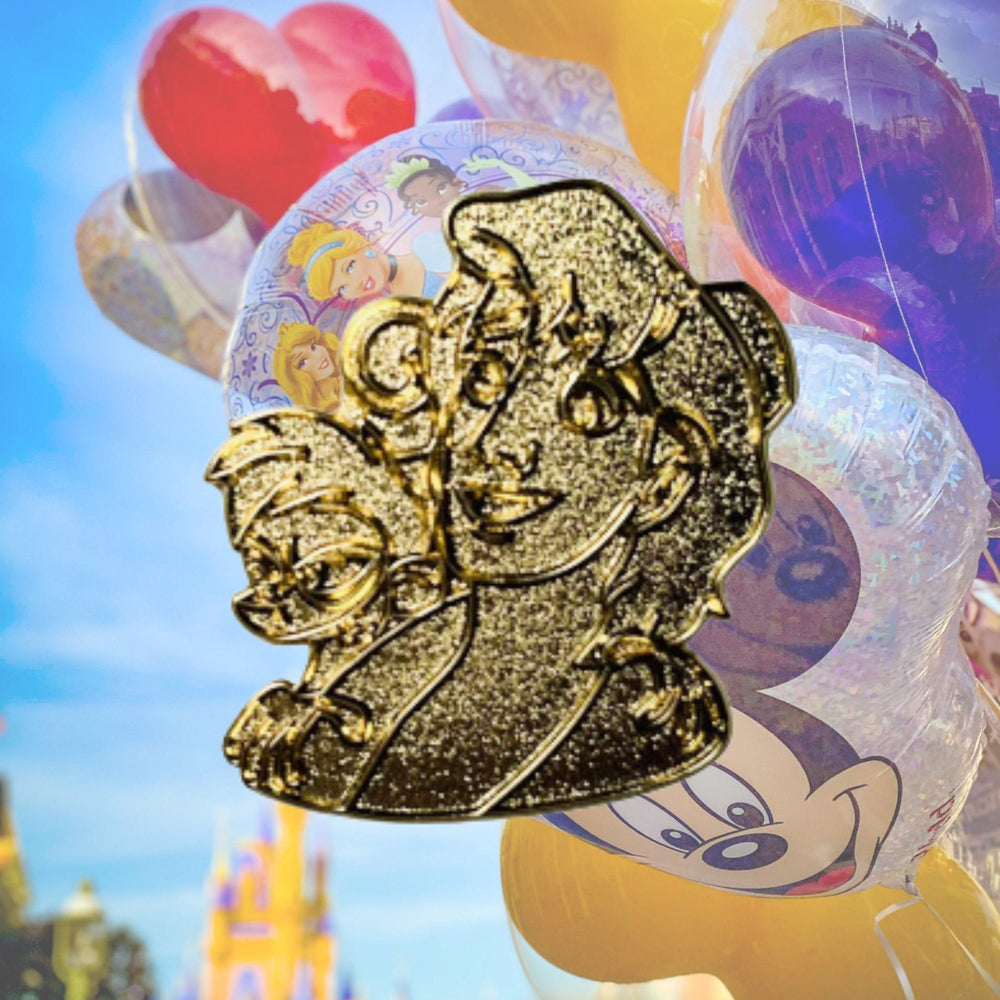 Sumérgete en la riqueza sensorial de Agrabah: los bulliciosos mercados perfumados con especias, las arenas doradas que se extienden bajo cielos infinitos, las estrellas centelleantes que presencian sueños susurrantes. Esta sección recrea la atmósfera que da vida al mundo de Aladino y Abu, capturando la magia que late en cada callejón y pasillo del palacio. Siente la emoción de volar en la alfombra mágica, la maravilla que evoca la sonrisa traviesa del genio y la calidez del amor que florece en medio de los desafíos. El pin cristaliza estas sensaciones en una prenda mágica y portátil.