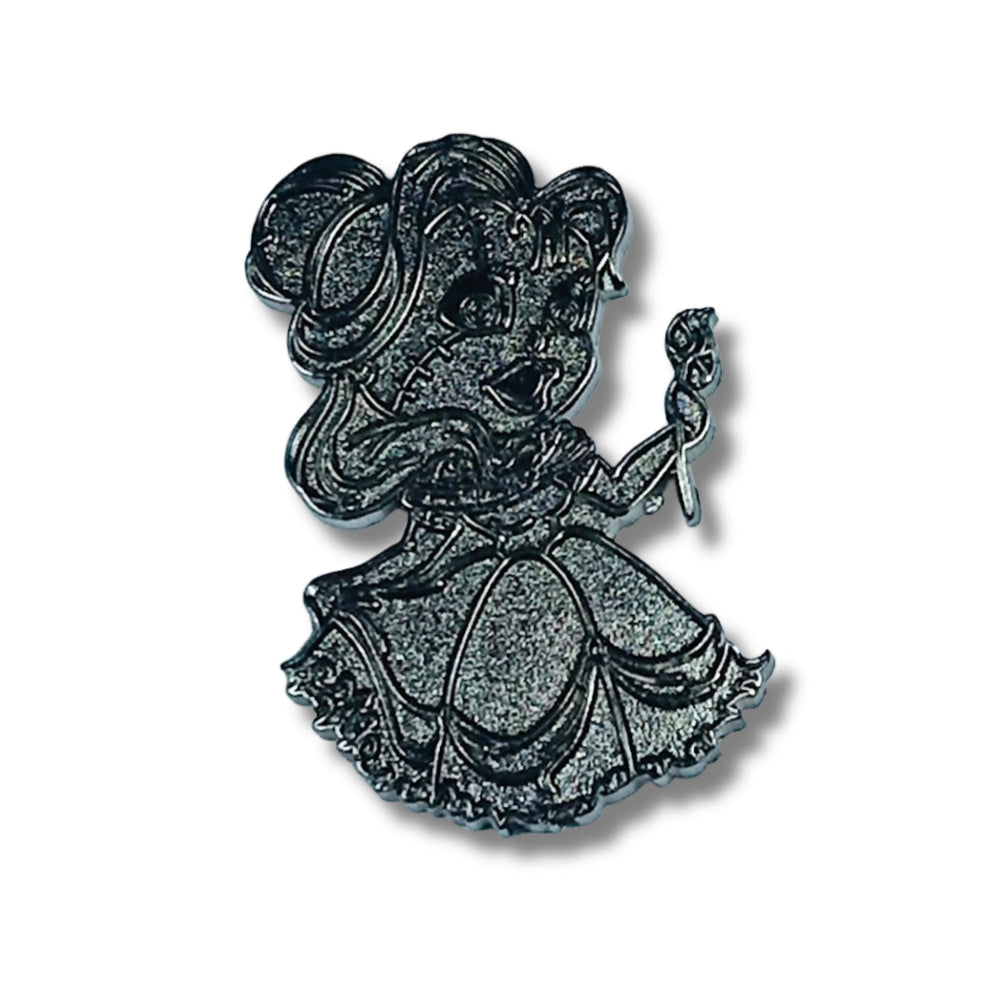 Cada mirada a este pin evoca la evocadora melodía de los olvidados salones de baile del castillo, los secretos susurrados de las noches encantadas y la eterna danza entre el amor y la oscuridad. Atrae a los coleccionistas que buscan expresar su pasión por la historia atemporal de Disney con un toque gótico y audaz: una pieza que es a la vez un homenaje y una reinvención.