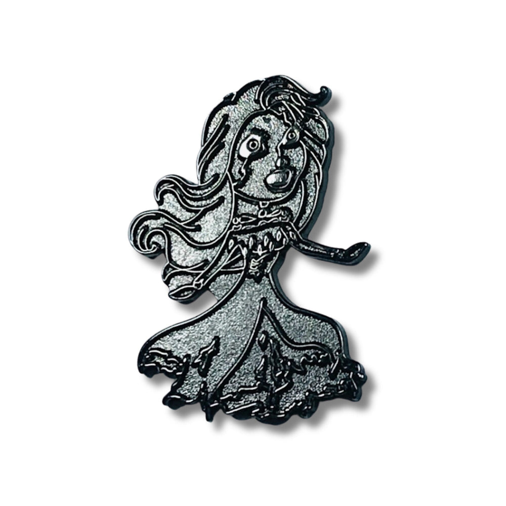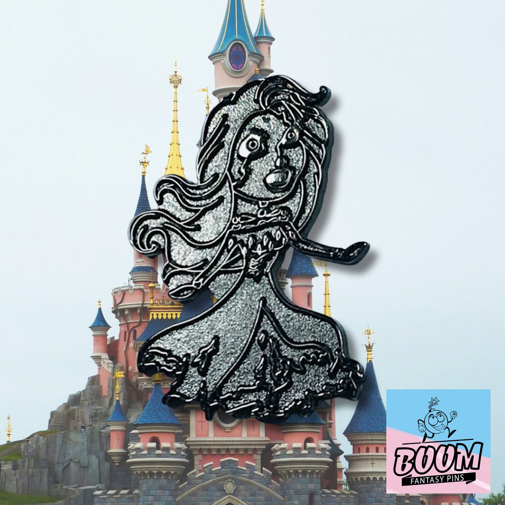Recuerda el icónico crescendo de la liberación de Elsa en la inolvidable escena de "Let It Go", donde el cristal congelado y los copos de nieve arremolinados danzaban en armonía, y una joven abrazó su verdadero ser con una valentía feroz. Este pin captura esa esencia misma de poder y vulnerabilidad, transformándola en una fascinante visión de no-muertos. Imagina su vestido, antes impecable, ahora hecho jirones y cubierto de escarcha; cada capa desgarrada es un testimonio del frío eterno que la ata entre la vida y la muerte. Sus ojos, antes cálidos y profundos, ahora arden con un fuego azul espectral: un faro de los poderes gélidos que han trascendido los límites mortales.