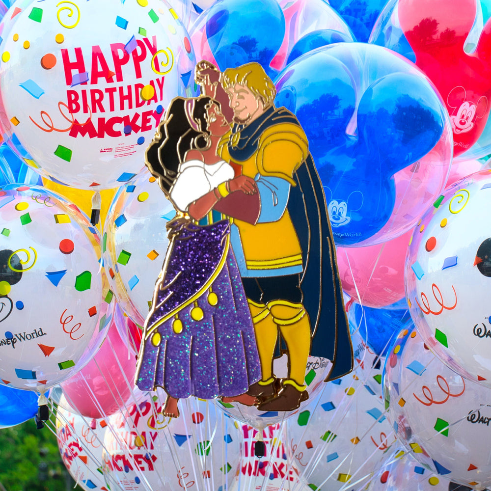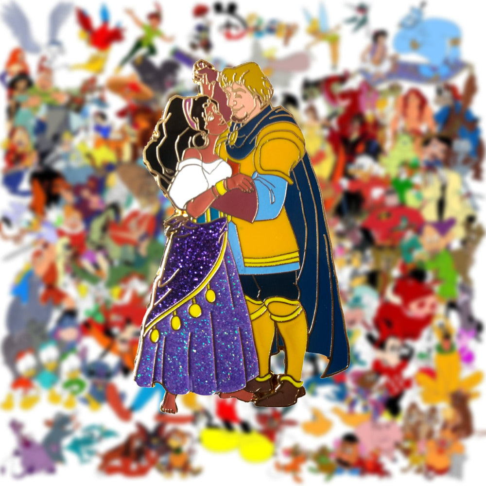 Los vibrantes colores y las poses dinámicas de este pin evocan la tensión dramática y la profundidad emocional de la narrativa, invitando a los fans no solo a celebrar a una pareja romántica, sino también a honrar una historia impregnada de rica tradición y temas atemporales. Desde la feroz rebeldía en la mirada de Esmeralda hasta la postura protectora de Febo, la obra de arte encapsula fuerza y vulnerabilidad, pasión y propósito: todos los elementos que hacen que esta historia sea adorada por generaciones.