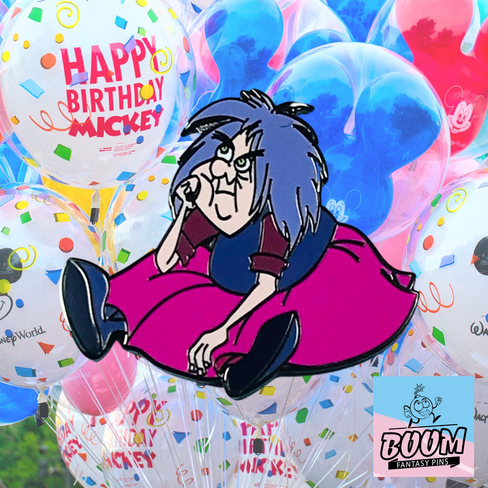 Las excéntricas túnicas de Madam Mim se arremolinan con atrevidos tonos verdes y morados, capturadas aquí en una pose que irradia su energía característica: desafiante, astuta y alegremente impredecible. Su sonrisa pícara, el arco salvaje de su capa ondulante, el destello mágico en sus ojos: cada pincelada te invita a revivir el espectáculo de sus batallas hechizantes y sus ingeniosas aventuras. Este pin no solo celebra a un personaje, sino un legado de travesuras animadas y encanto que los fans atesoran profundamente.