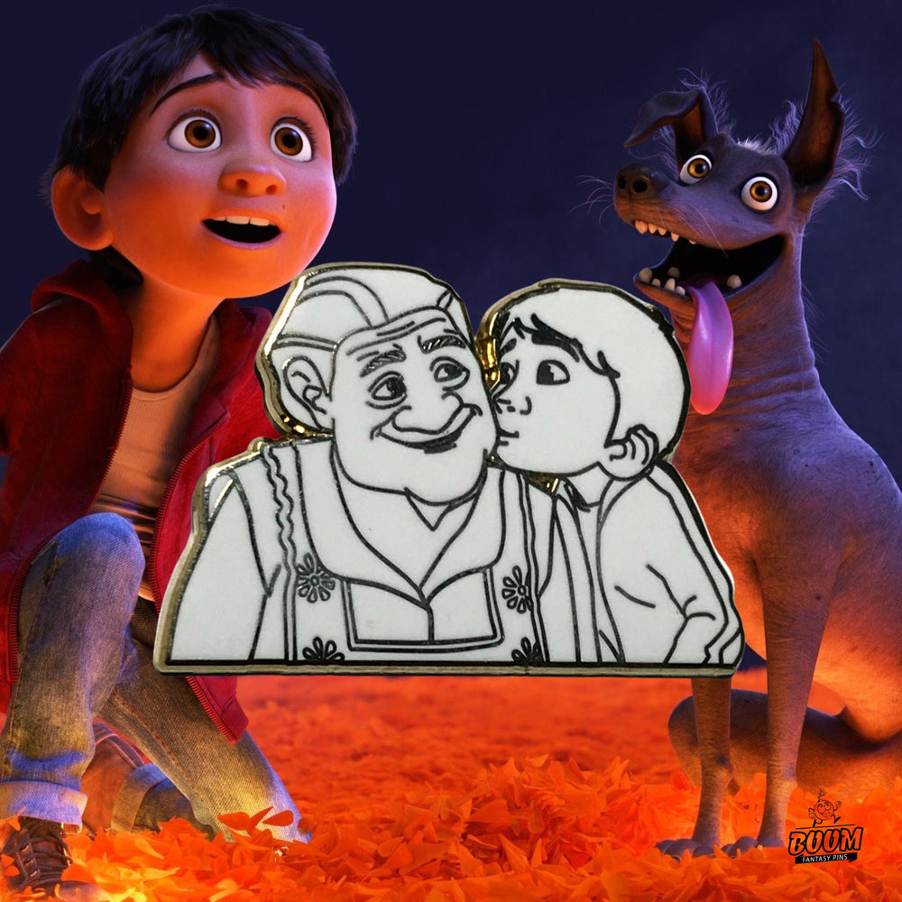 Cada detalle evoca los vibrantes colores y la profundidad emocional de las impresionantes imágenes de la película. Desde los intrincados patrones inspirados en el tradicional papel picado hasta las tiernas expresiones que revelan historias inéditas, esta pieza te invita a revivir el delicado equilibrio de alegría y melancolía que define a Coco . No es solo un pin; es un portal a un mundo donde el legado familiar se entrelaza con la música y la memoria, donde cada mirada evoca la sagrada promesa de recordar.