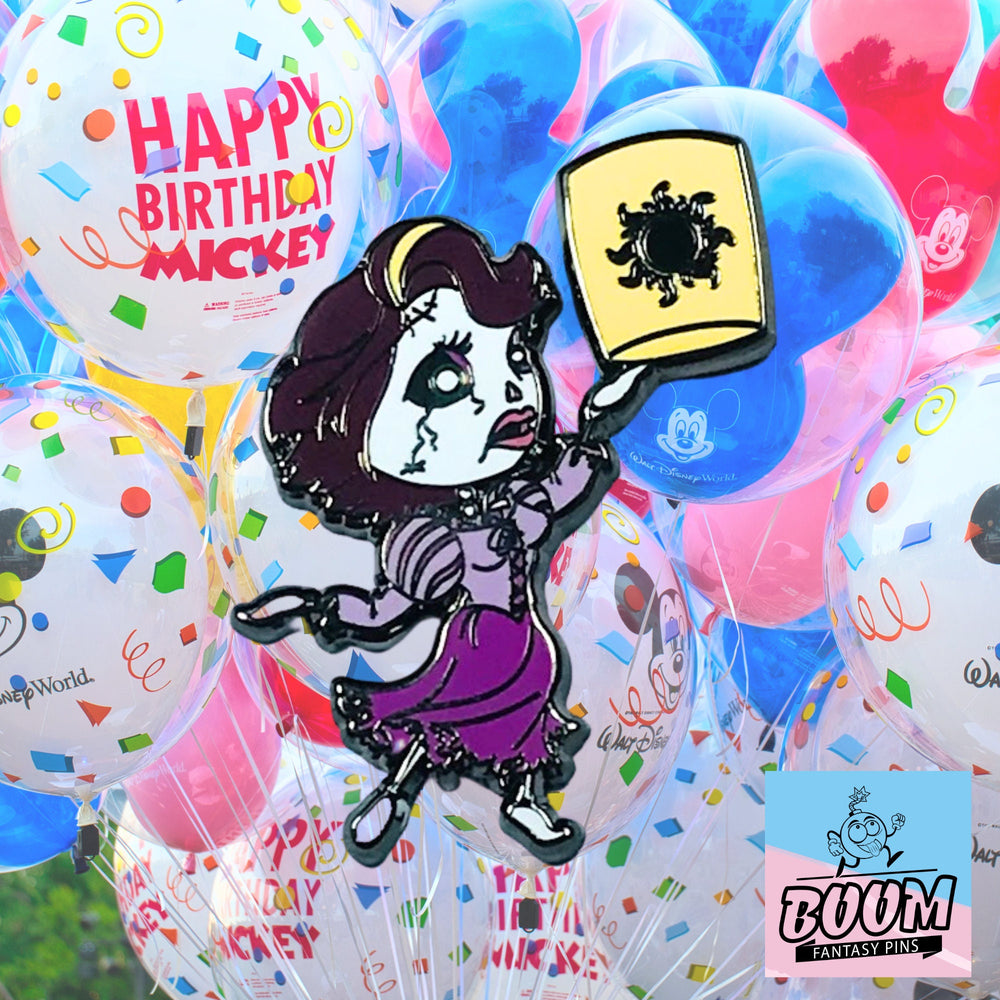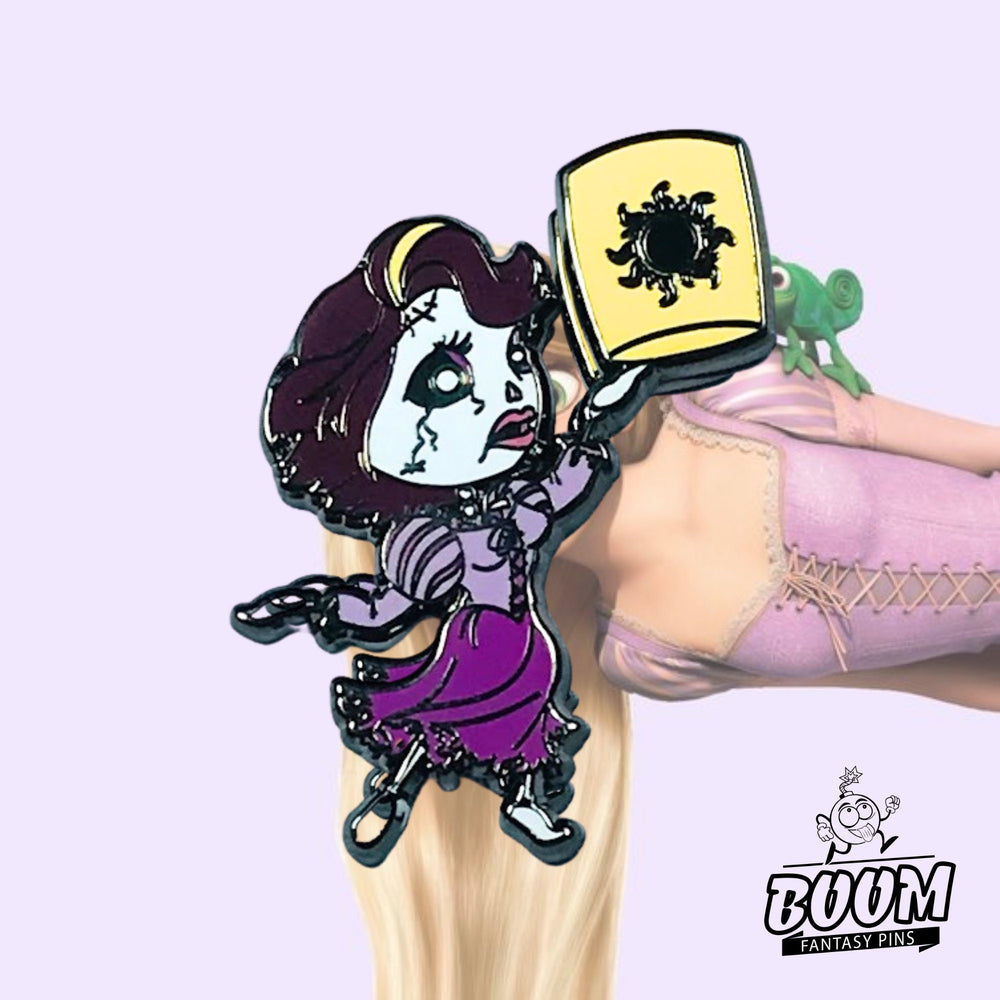 Creado con minuciosa atención al detalle, este pin es una obra maestra de arte pintado a mano. La inspiración se inspira en motivos góticos clásicos y la vibrante narrativa de Enredados de Disney, culminando en un diseño tan cautivador como hermoso. Desde los intrincados mechones de cabello zombificado hasta los sutiles desgarros de tela en su vestido real, cada elemento cuenta una historia. La paleta de colores —púrpuras intensos, grises etéreos y dorados brillantes— evoca el espacio liminal entre el día y la noche, la vida y el más allá. Es una celebración de la creatividad, la pasión y el poder transformador de las narrativas reinventadas.