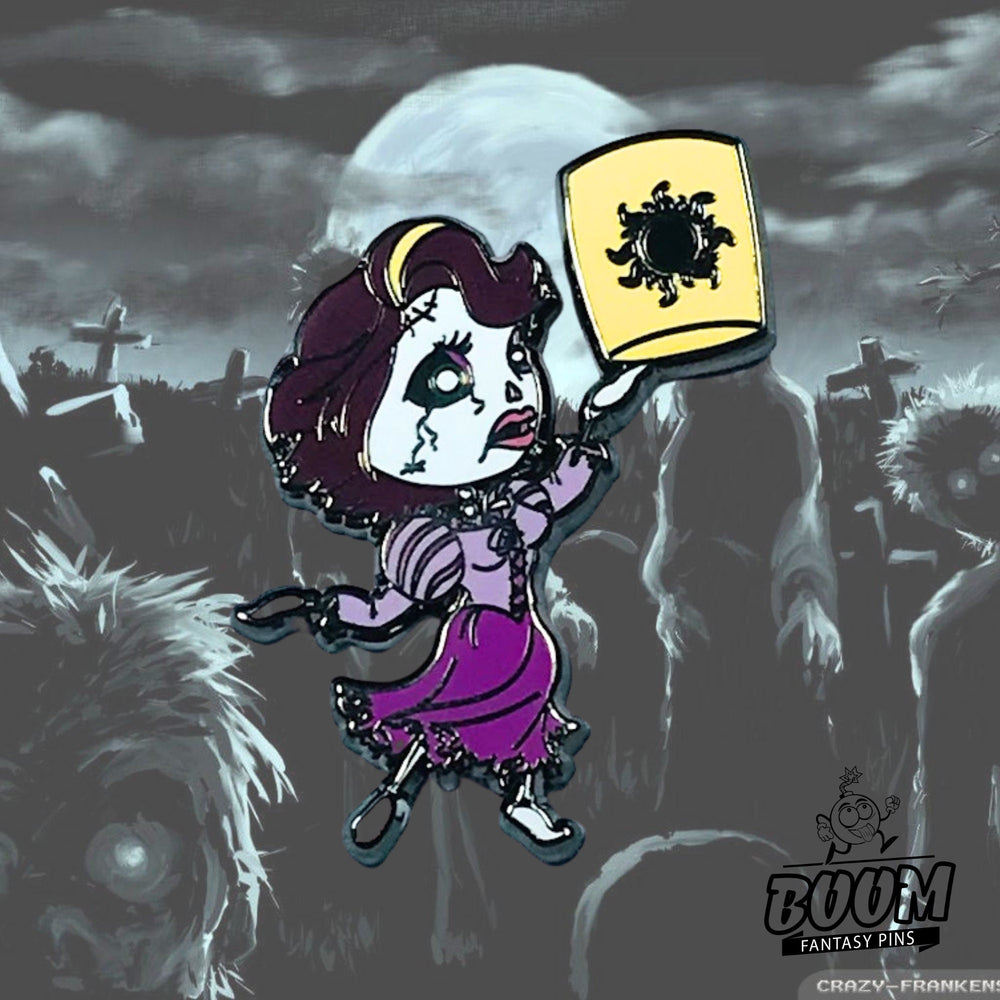 🎬 Atraviesa el velo donde el resplandor radiante de un cuento de hadas se encuentra con los susurros sombríos de lo macabro y entra en el mundo de Pin – Rapunzel de Enredados – Disney Fantasy | Regalo coleccionable de princesa zombi para entusiastas del crossover de terror y cuentos de hadas . Este es un reino donde el cabello dorado ya no brilla con la calidez de la luz del sol, sino que brilla con una luz misteriosa y de otro mundo, donde la inocencia y el encanto se entrelazan con el misterioso atractivo de la gracia de los no muertos. Imagina las imponentes torres de un reino olvidado, los muros que una vez mantuvieron cautiva a una princesa enérgica, ahora envueltos en inquietantes tonos crepusculares, susurrando secretos de transformación y resiliencia.