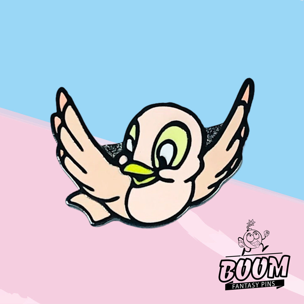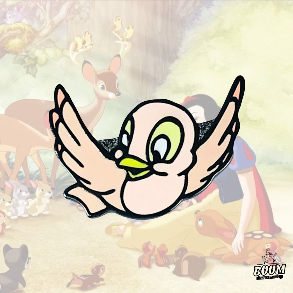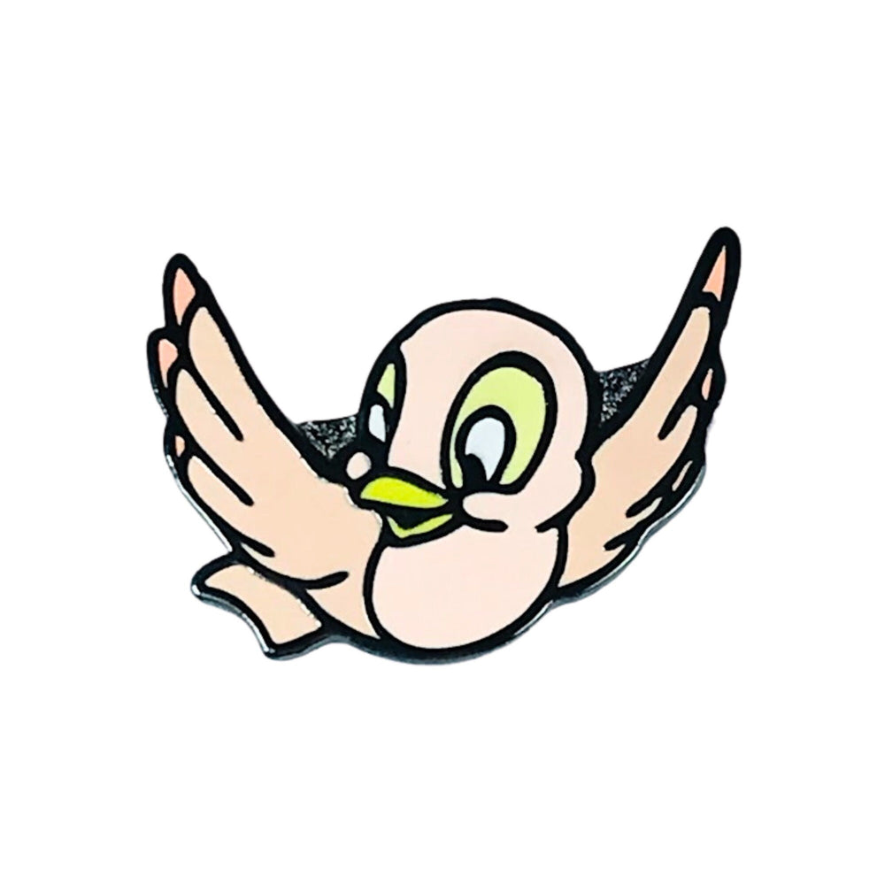🌸 Encantamiento de pájaro rosa : el caprichoso pájaro rosa posado cerca simboliza la inocencia y el vínculo mágico entre Blancanieves y las criaturas del bosque, lo que realza el encanto de cuento de hadas del pin.