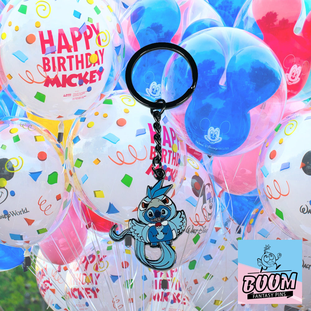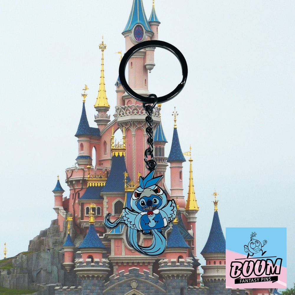 Dans ce porte-clés, les reflets bleus chatoyants et les accents givrés évoquent la scène haletante de la fuite, digne d'un conte de fées, où chaos et tendresse s'entremêlent et où la loyauté indéfectible de Stitch brille de mille feux. Le plumage glacé d'Artikodin confère une majesté digne à la silhouette espiègle de Stitch, symbolisant une transformation finale lors du combat, unissant force et compassion. C'est un hommage à la croissance, au changement et aux liens indéfectibles qui définissent le concept hawaïen d' ohana .