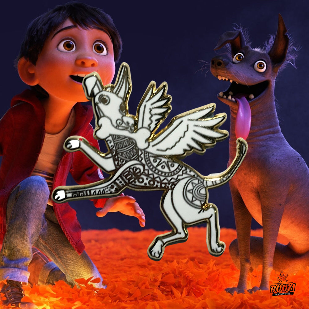 Le Pays des Morts n'est pas qu'un simple décor, mais une entité vivante et vibrante, scintillante de chemins lumineux et résonnant de chants. Les joyeuses escapades de Dante dans ce paysage magique sont des moments de pur bonheur, symbolisant la liberté et la joie que procure une véritable amitié. Cette broche capture cette énergie dans des teintes d'émail éclatantes, reflétant les œillets d'Inde radieux et les décorations festives qui illuminent le cœur émotionnel du récit.