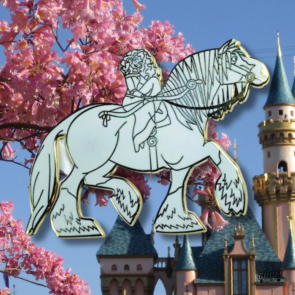 - 🌿 L'Étreinte de la Nature — Sur un fond blanc immaculé, l'épingle met en valeur le vert luxuriant de la robe de Merida et la beauté naturelle des paysages de DunBroch, évoquant la magie des forêts écossaises et des collines ondulantes.