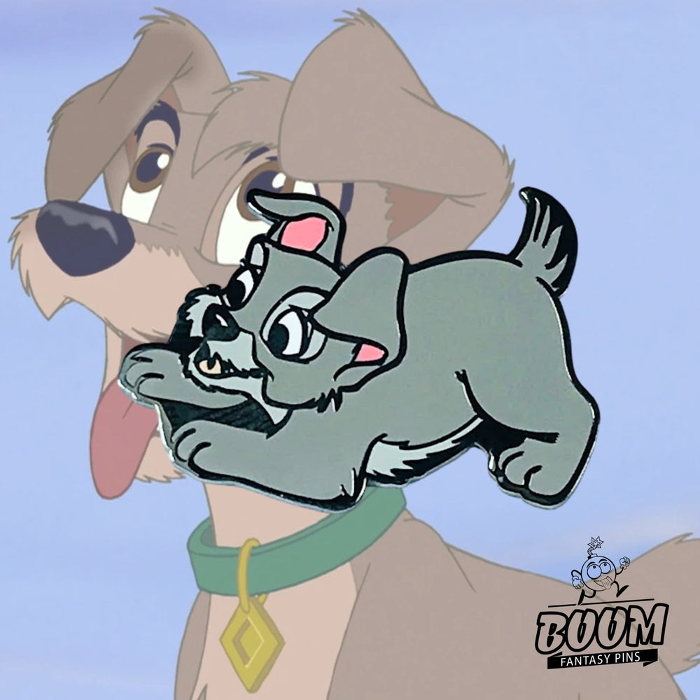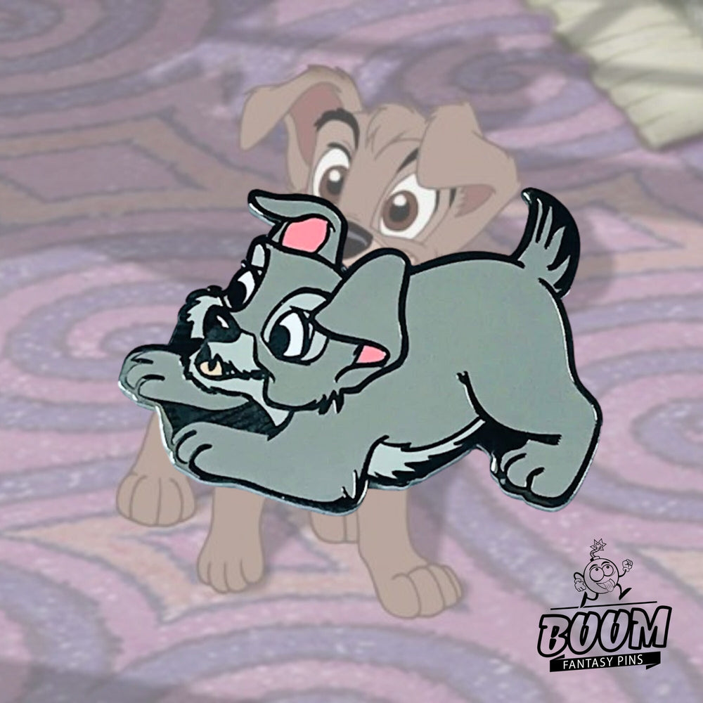 Imaginez la douce lueur d'une maison douillette s'estompant dans le murmure lointain du monde extérieur, où les pattes de Scamp s'agrippent avec empressement au trottoir frais, poursuivant des rêves peints de poussière d'étoiles et de promesses. Ses yeux pétillants reflètent le clair de lune, emplis de questions que seul un jeune cœur ose poser : Qu'y a-t-il au-delà des repères familiers ? Quelles aventures l'attendent au-delà des haies et de la lumière des lampadaires ? C'est ici, dans la course folle d'un chiot lancé à la poursuite de son destin, que la magie de La Belle et le Clochard se déploie à nouveau. Cette broche capture non seulement un personnage, mais l'essence même de cette danse audacieuse de l'enfance entre sécurité et exploration.