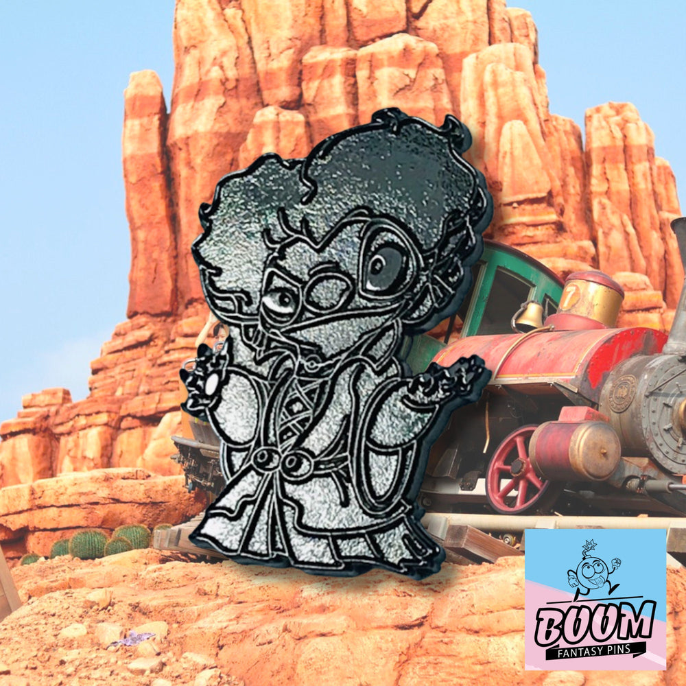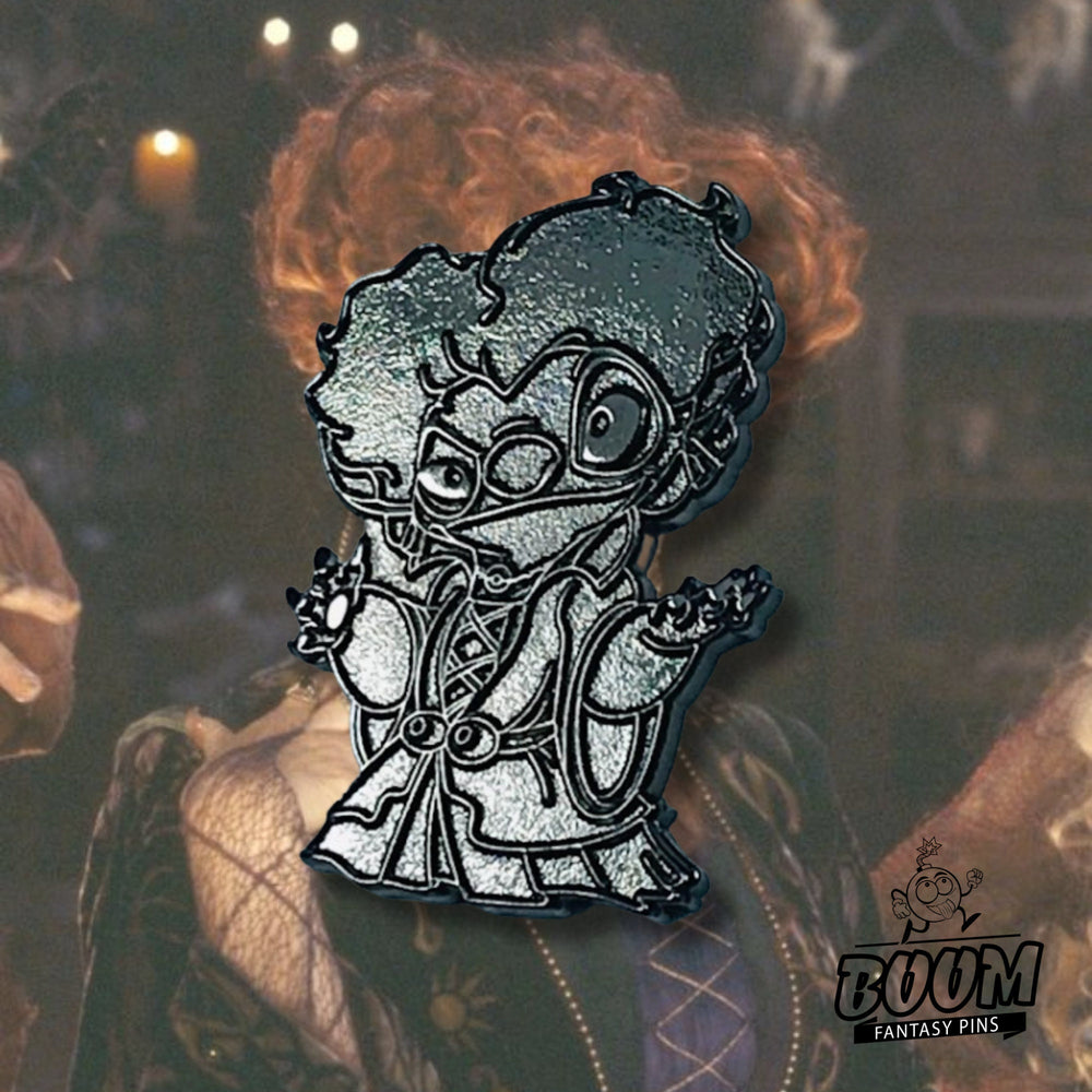 Plongez au cœur de cette fusion extraordinaire où le joyeux chaos de l'Expérience 626 se mêle au mystère envoûtant de Winnifred Sanderson. Stitch, incarnation de la malice et de la métamorphose, captive les cœurs depuis longtemps par son parcours, d'expérience cosmique à membre adoré de la famille. Ce pin's symbolise cette évolution, tissant un récit d'identité et de courage.