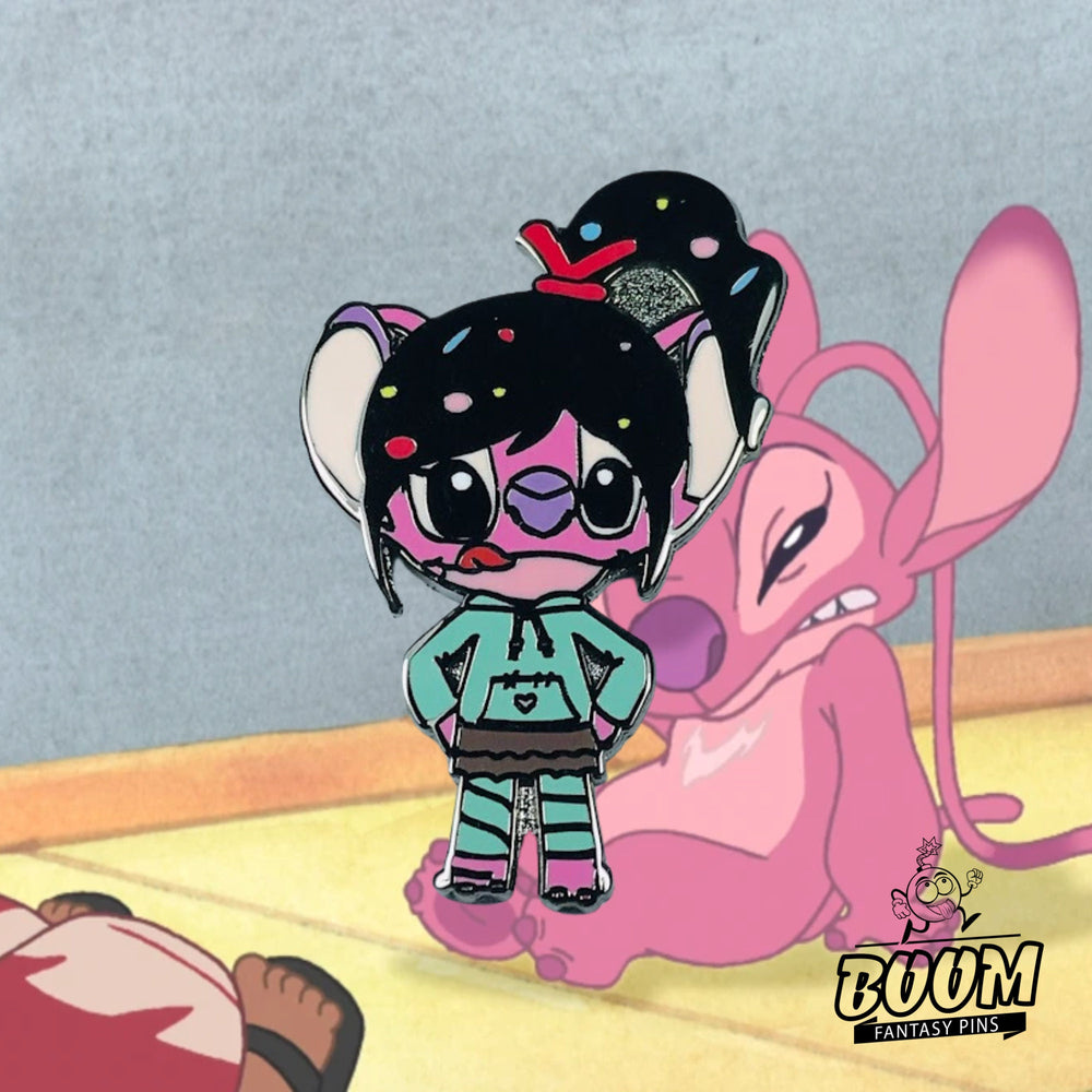 In this crossover realm, Angel’s tender story as an alien experiment transformed by love intertwines seamlessly with Vanellope’s fearless drive to claim her place in the racing world. Here, the themes of acceptance, courage, and family pulse like the heartbeat of an island drum beneath the neon glow of candy-striped arcades. Every detail in this pin captures that dynamic spirit—from Angel’s delicate pink glow to Vanellope’s iconic hoodie and spunky smile—inviting fans to relive moments where belonging and individuality unite in joyful harmony.
