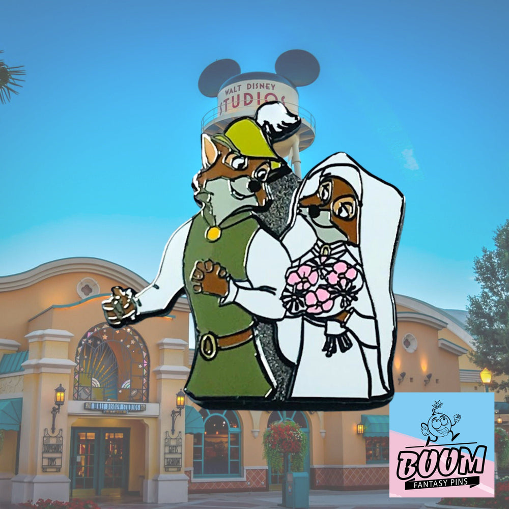 This Pin – Maid Marian and Robin Hood from Robin Hood – Disney Fantasy | Sherwood Forest Couple Wedding Collectible Archery Romance Accessory is a tribute to the enduring love story set against the lush greens and earthy textures of Sherwood Forest. The design encapsulates the essence of their wedding day — a radiant moment of hope, courage, and timeless romance. The hero’s signature feathered hat 🎩 and iconic emerald attire 🍃 contrast beautifully with Maid Marian’s flowing gown and graceful pose, creating a harmonious blend of strength and tenderness.