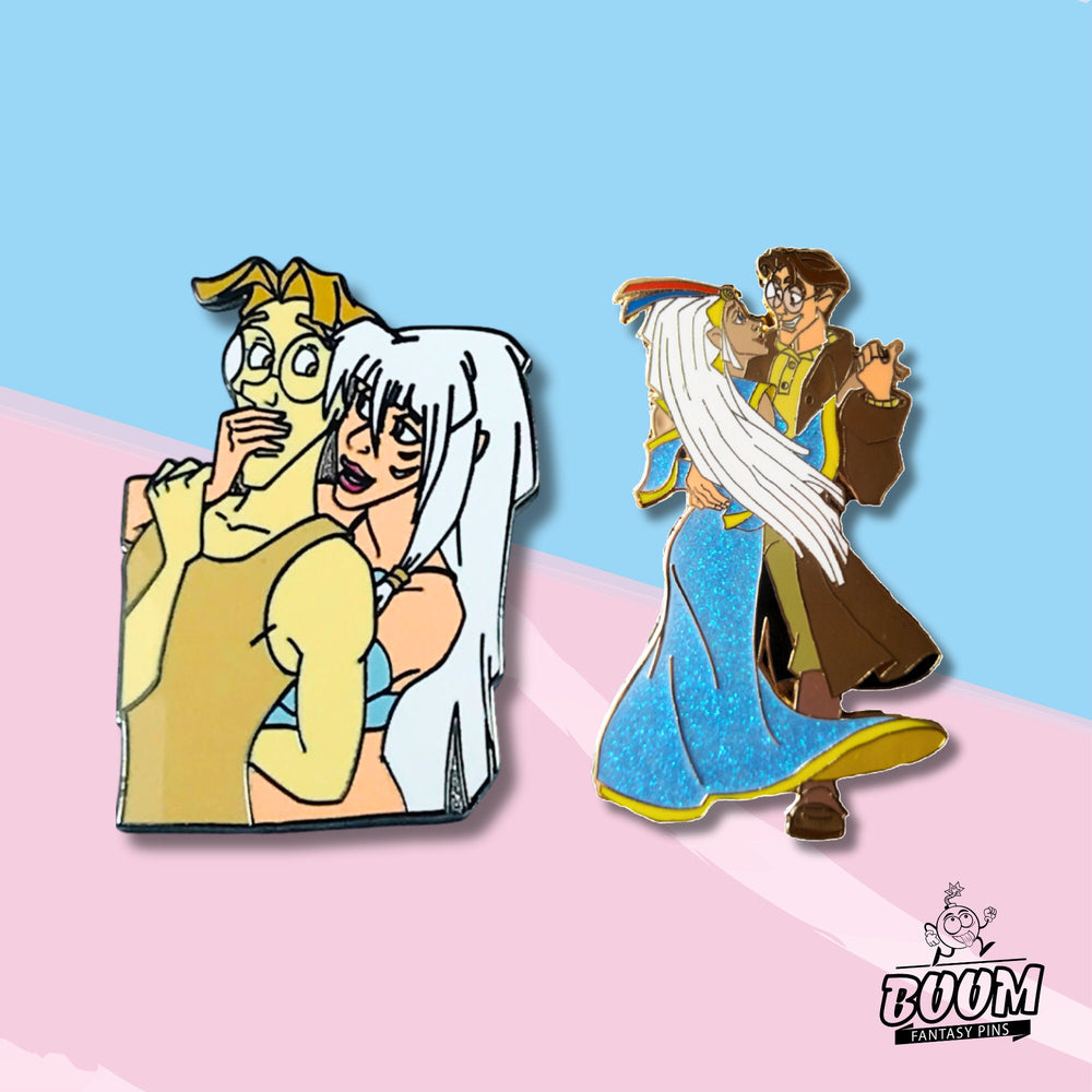 With radiant blues echoing the glowing waters of Atlantis and earthy tones grounding their connection to the ancient land, the design is a vivid homage to their iconic moment of unity. Milo’s inquisitive gaze meets Kida’s regal composure, immortalizing the delicate balance of curiosity and strength that defines their story. This pin draws inspiration from the unforgettable sequence where the lost empire stirs to life, evoking the thrill of exploration and the warmth of burgeoning romance that has resonated with fans for decades.